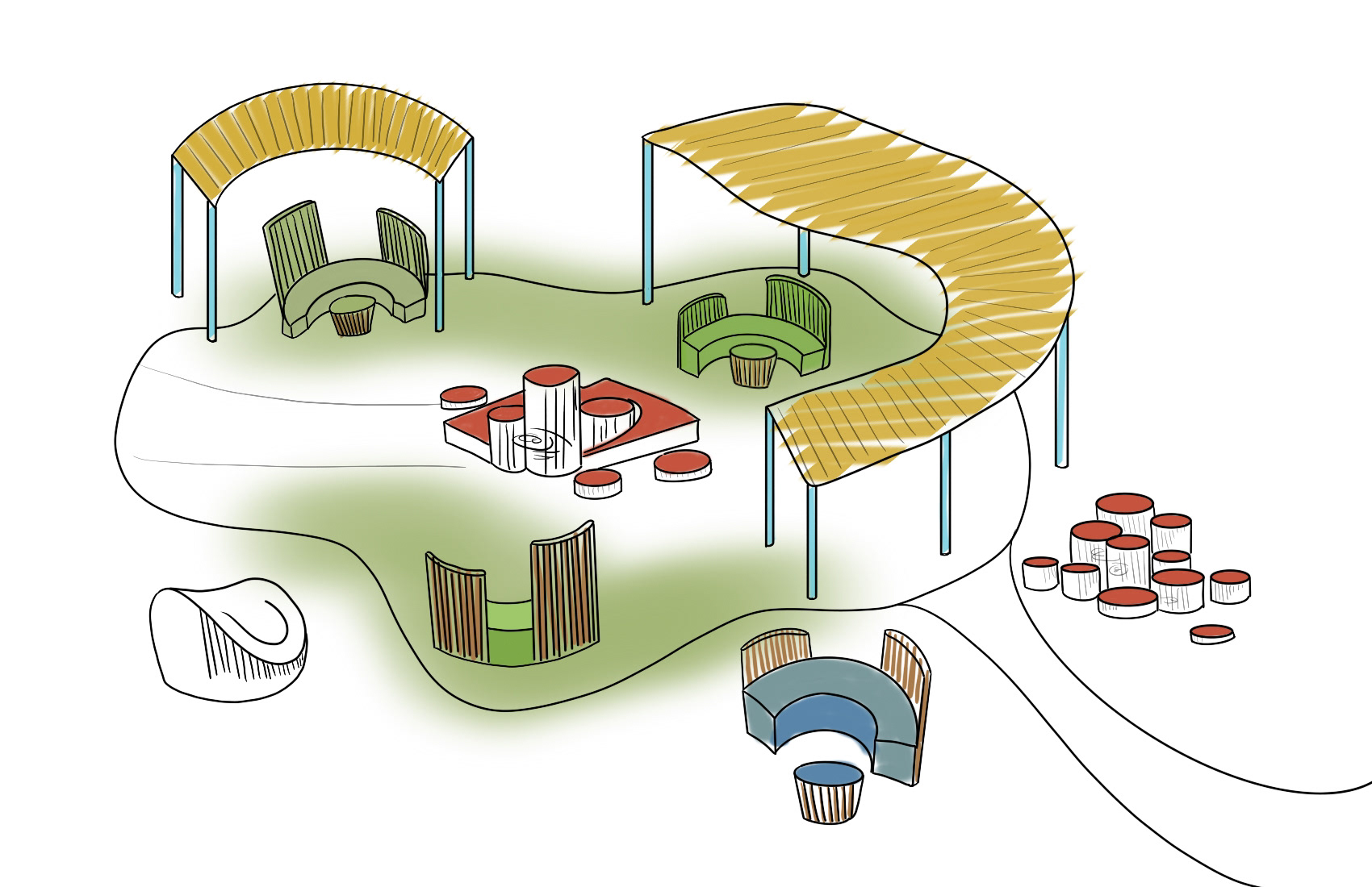 stageThe stage is set up as a multi-platform gathering space with curated seating to spark conversation between community members. There are ramps from the ground to allow for inclusive access. Wood composite slats create mini-zones and separate talking areas without blocking sight-lines, and seats are angled towards each other to promote interaction while maintaining a wide field of view.